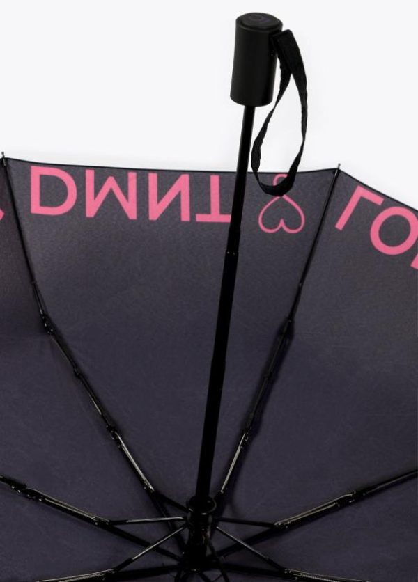 Paraguas negro con logotipado en color fucsia. Apertura automática en 3 secciones y varillaje de aluminio. Funda protectora con el mismo estampado y asa de mano.