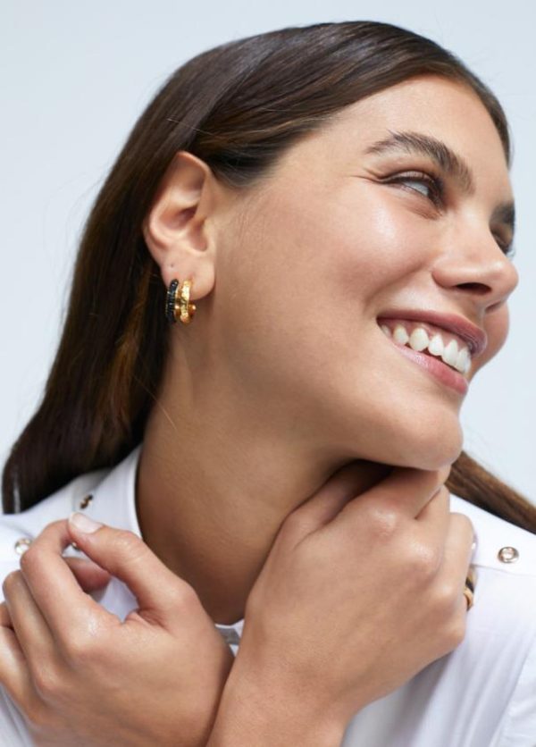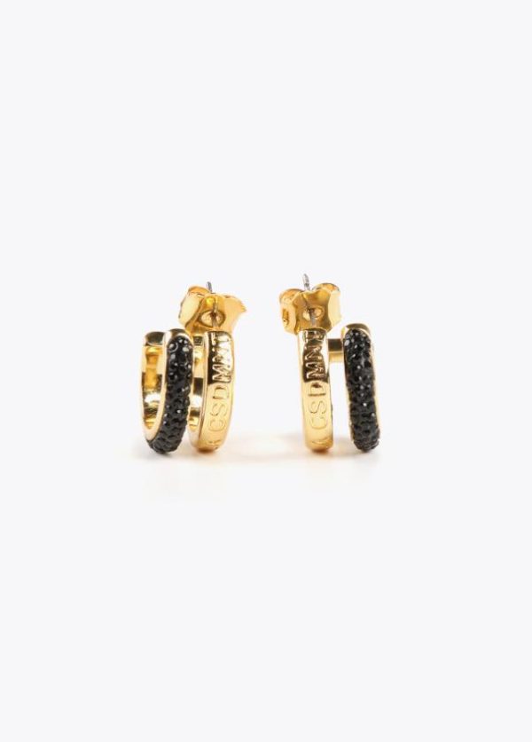Pendientes dorados de aro doble logotipado y con piedras de color combinados.