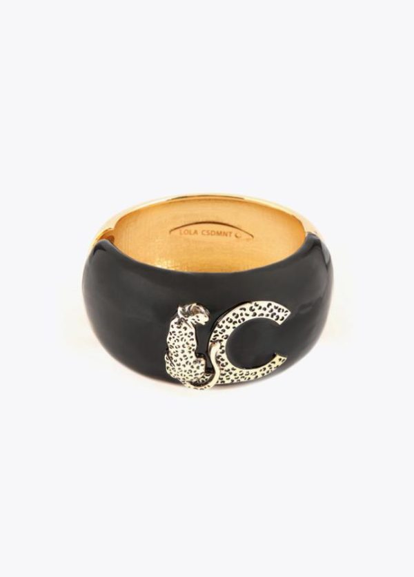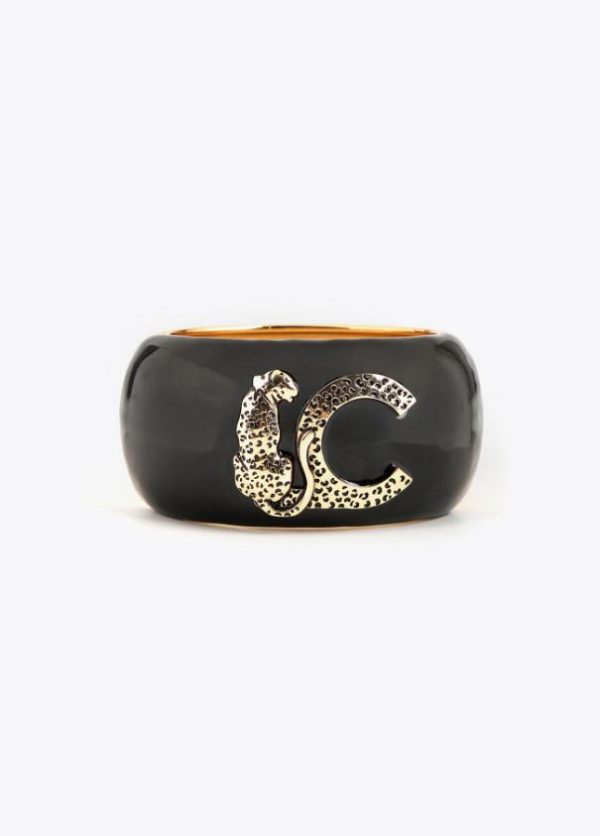 Pulsera dorada ancha y lacada en color negro con logo animal en parte superior.