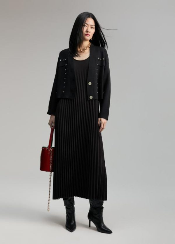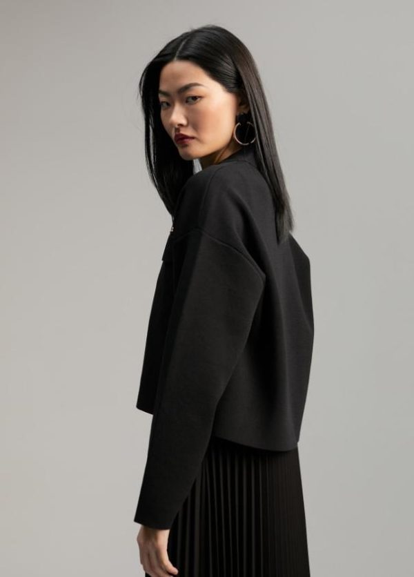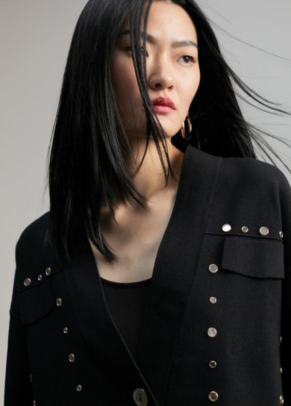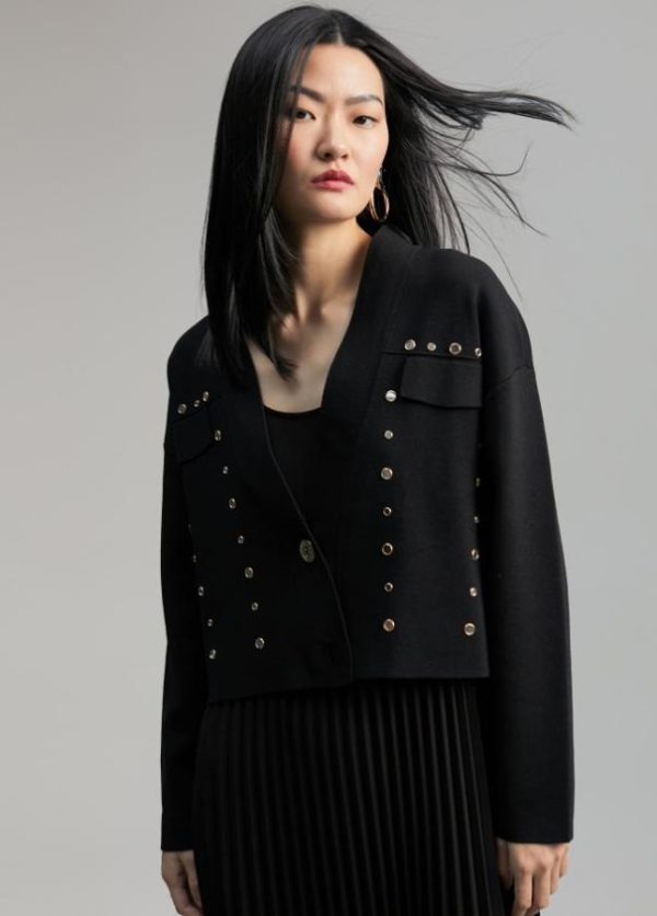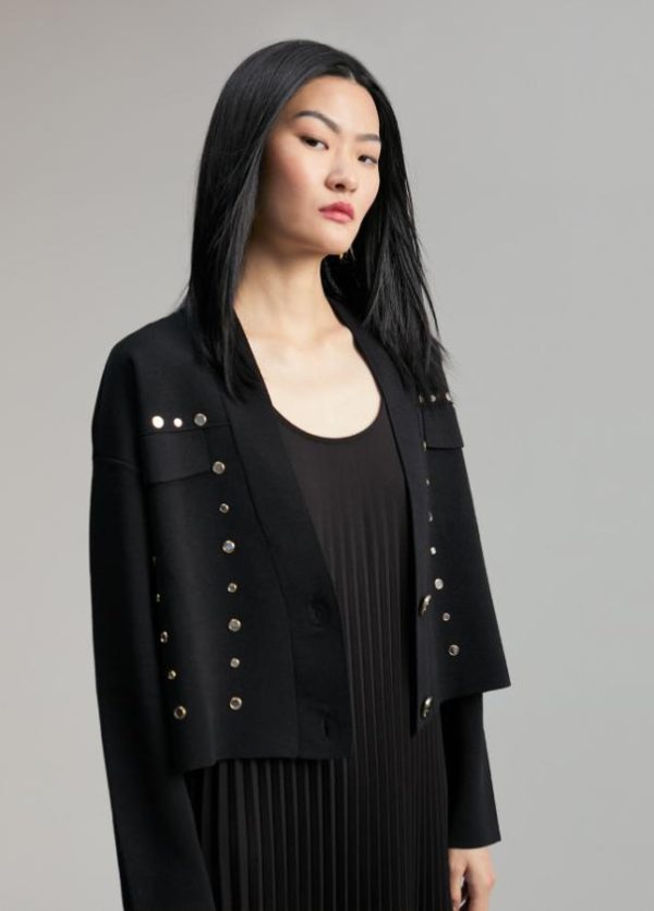 Cárdigan corto. Tapetes frontales y cerrado con dos botones metálicos. Detalle de mini espejos metálicos.