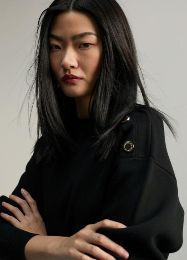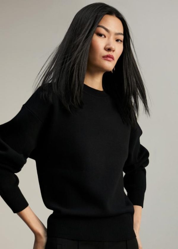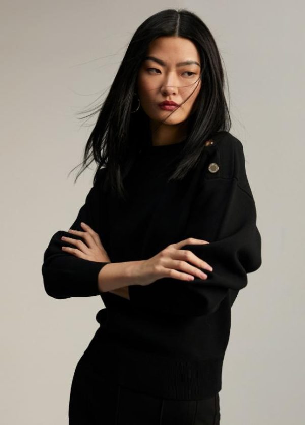 Jersey de punto de manga larga y cuello caja. Detalle de botones dorados en hombro.