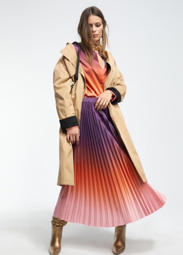 Falda plisada en color degradé. Cintura ajustable y de largo midi.