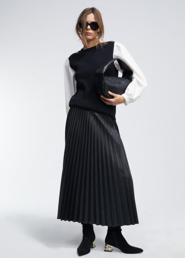 Falda de largo midi. Plisada en efecto piel. Detalle de botones metálicos en cinturilla.