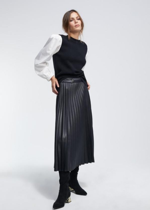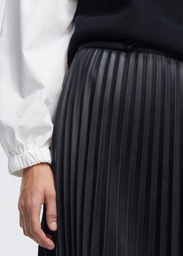 Falda de largo midi. Plisada en efecto piel. Detalle de botones metálicos en cinturilla.