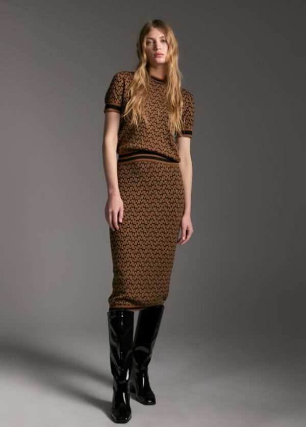 Falda de punto en estampado monograma bicolor. Cintura y bajo con rib contrastado.