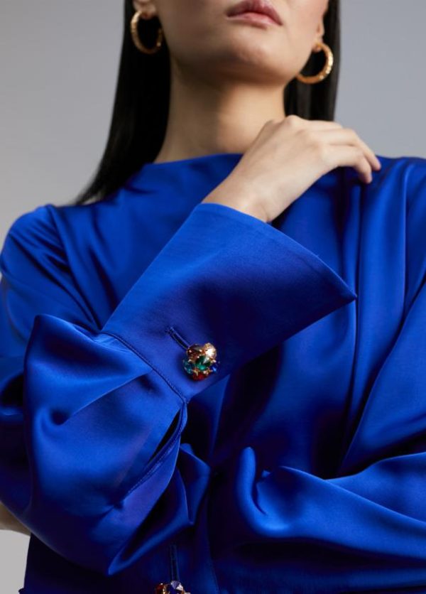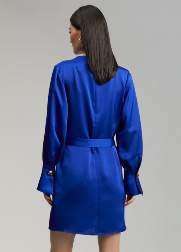 Vestido corto satinado de cuello caja y manga larga. Puños camiseros con detalle botón joya. Cinturón del mismo tejido y color.