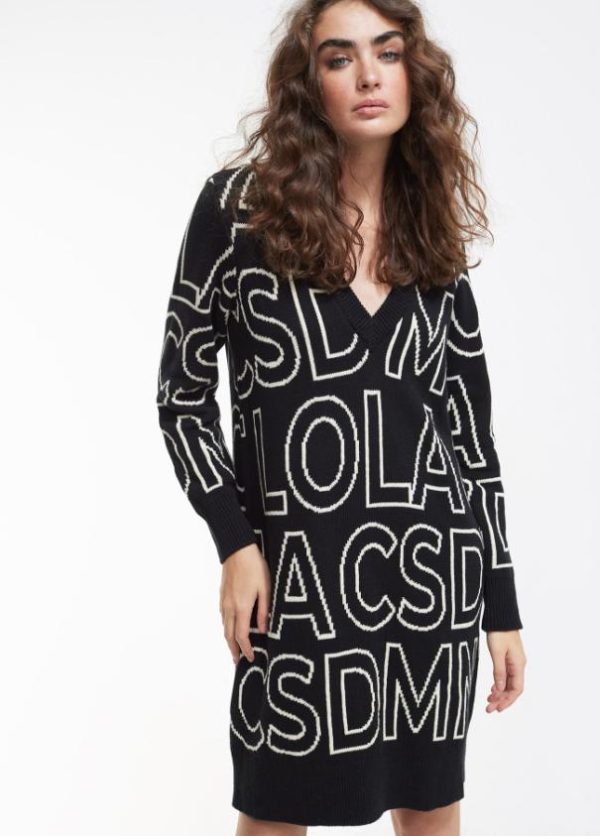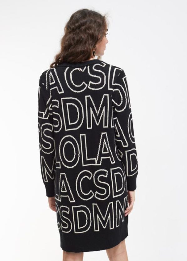 Vestido de punto de cuello pico. Estampado con maxi letras en color contrastado.