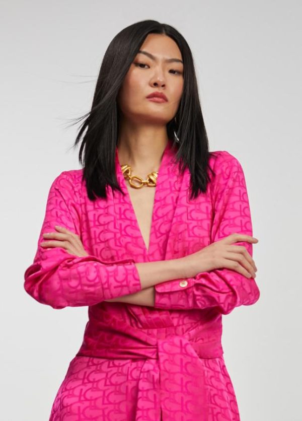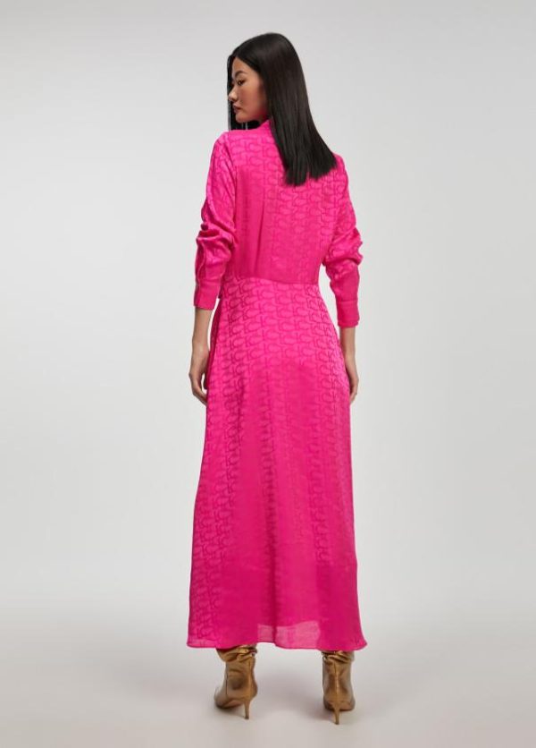 Vestido de largo midi. Tejido estampado logotipado a tono. Escote pico con lazada en cintura. Puños con detalle botón dorado.
