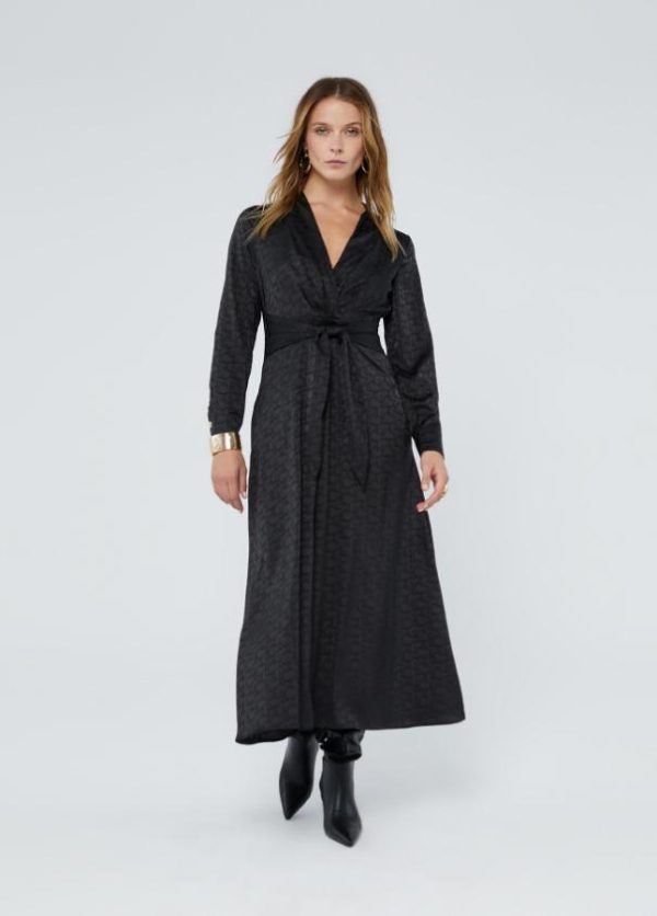 Vestido de largo midi. Tejido estampado logotipado a tono. Escote pico con lazada en cintura. Puños con detalle botón dorado.