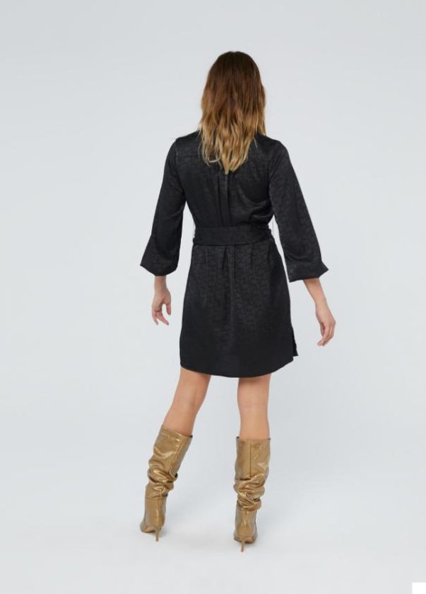 Vestido corto con tejido logotipado a tono. Cuello pico, bolsillos laterales y lazada en cintura. Puños camiseros con botón dorado.