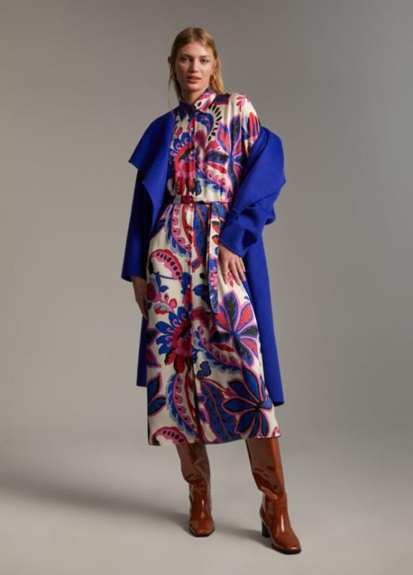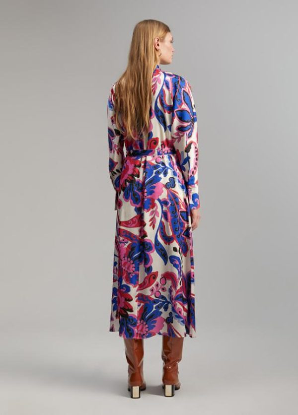 Vestido camisero de largo midi. Estampado paisley. Cuello y puños camiseros y abierto con botones. Cinturón del mismo tejido y estampado.