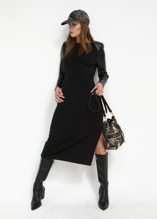 Vestido midi de punto roma. Cuello caja, hombreras y mangas en efecto piel. Abertura lateral en bajo.