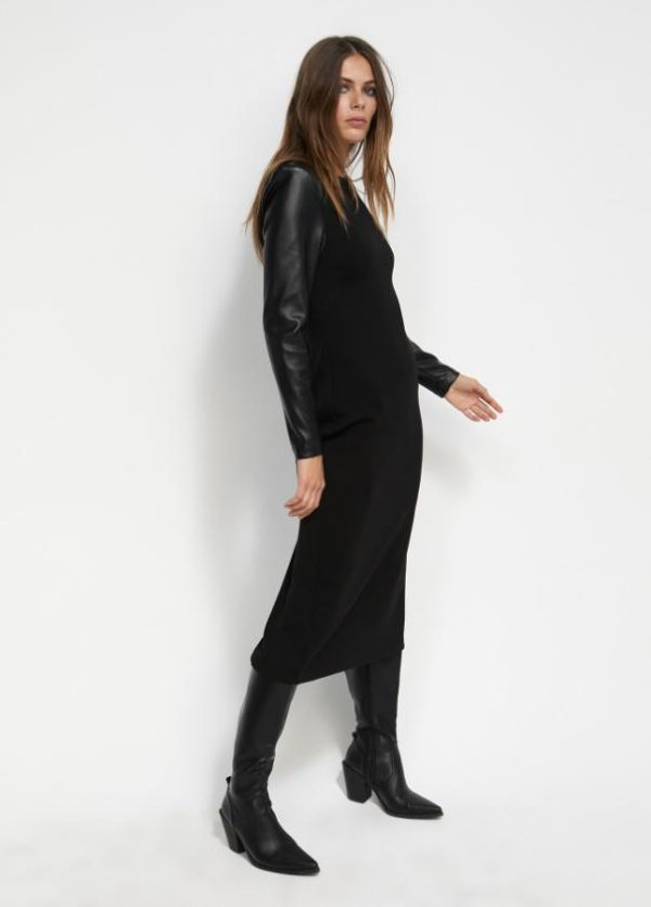 Vestido midi de punto roma. Cuello caja, hombreras y mangas en efecto piel. Abertura lateral en bajo.