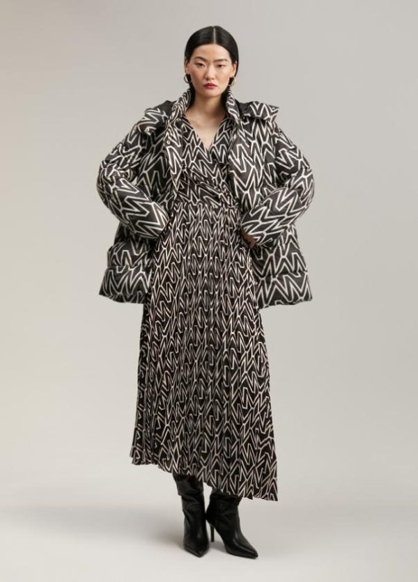 Vestido estampado en monograma M bicolor. Escote cruzado. Falda plisada.