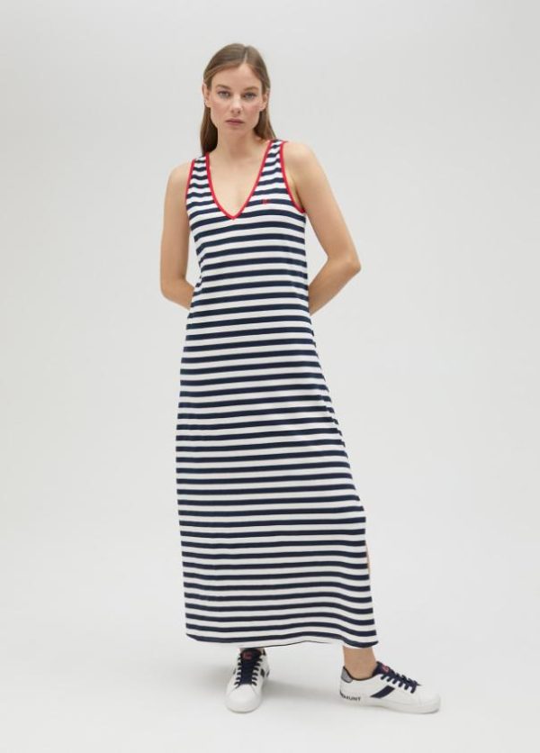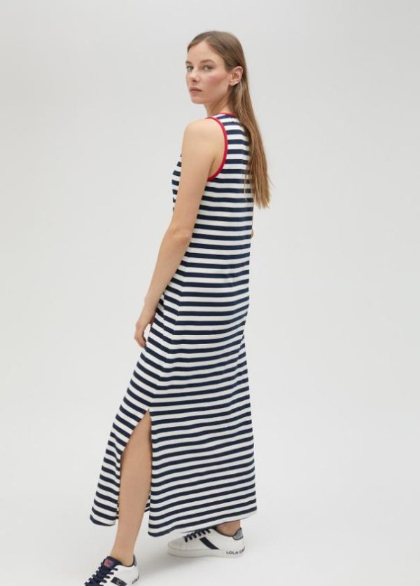 Vestido midi confeccionado en hilatura 100% de algodón. Escote pico y tirantes anchos. Estampación de raya bicolor con detalle de logo a contraste en delantero.