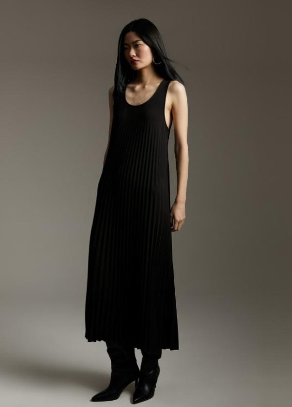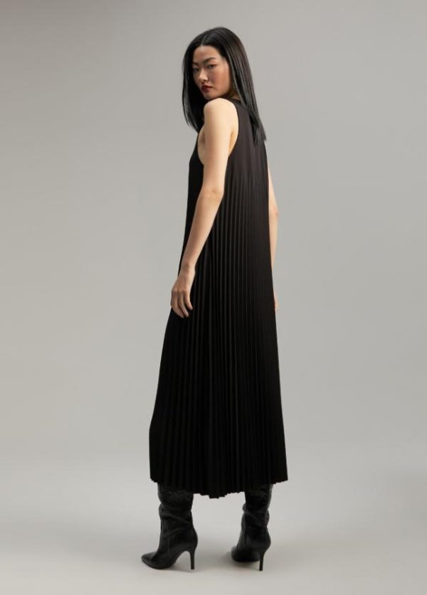 Vestido sin mangas y de tirantes. Plisado y de largo midi.