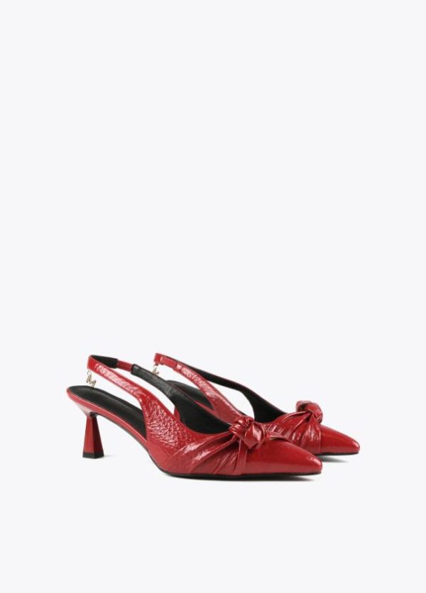 Zapato tipo stiletto destalonado en textura grabada y nudo en zona frontal. Detalle letra logo dorada y plantilla logotipada.